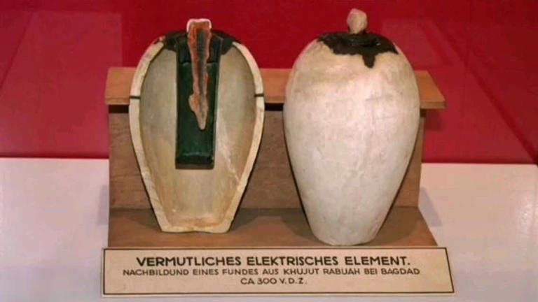 是一個類似花瓶的陶器,瓶里裝滿了瀝青。瀝青中有一個銅管,頂部有一層瀝青絕緣體。里面還有一個鐵棒,鐵棒上面有明顯被酸性液體腐蝕過的痕跡,之后考古學(xué)家對這些奇怪的文物進(jìn)行了研究,經(jīng)過鑒定專家認(rèn)為,這個異常奇特的文物是2000多年前古人使用過的電池,他說:這些出土的銅管、鐵棒和陶器是古代使用的電池。只要向陶瓶內(nèi)倒入一些酸或堿性水,便可以發(fā)出電來。由于這種2000年前的電池是在巴格達(dá)近郊地下石棺內(nèi)發(fā)現(xiàn)的,所以,人們把它稱為巴格達(dá)古電池。如果說2000多年前的人類能夠制造出電池,那么當(dāng)時的科技會有多么發(fā)達(dá)呢?